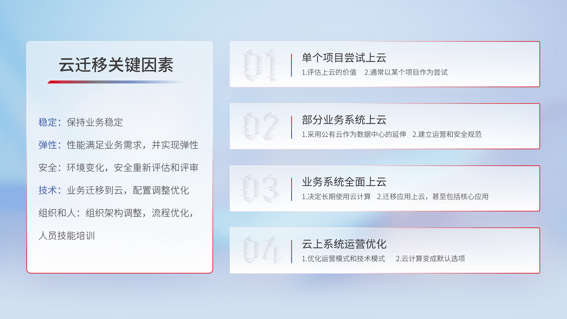 结合实际业务,,从规划设计、、云平台选型、、云原生改造、、、数据迁移、、、、集成交付,,迁移全过程为客户识别最佳上云路径,,,做好风险识别管理,,设计网络架构、、、身份权限、、、安全审计合规、、操作审计、、、日志审计、、监控告警策略、、、、多站点容灾设计等,,对云上基础设施进行整体规划,,,,提升IT治理水平,,,以满足弹性、、高可用、、、高性能的需求。。