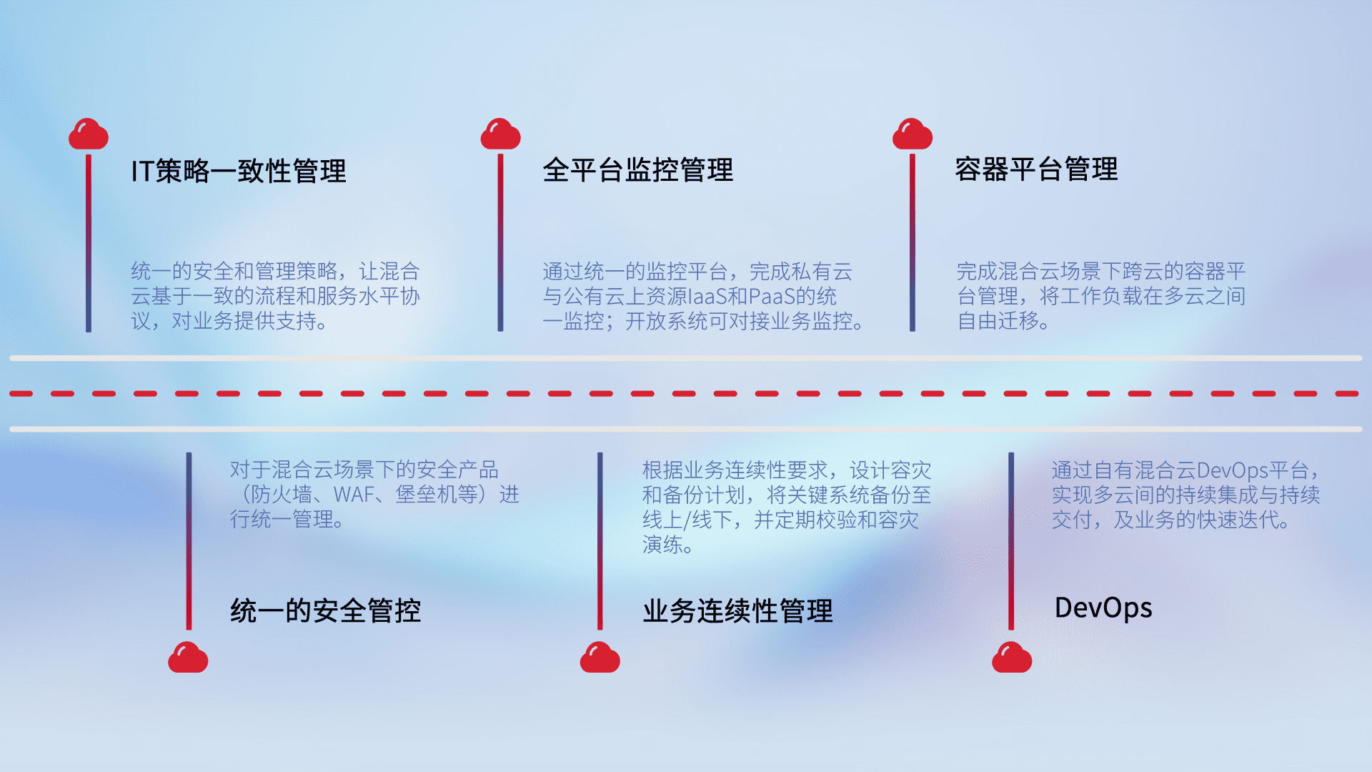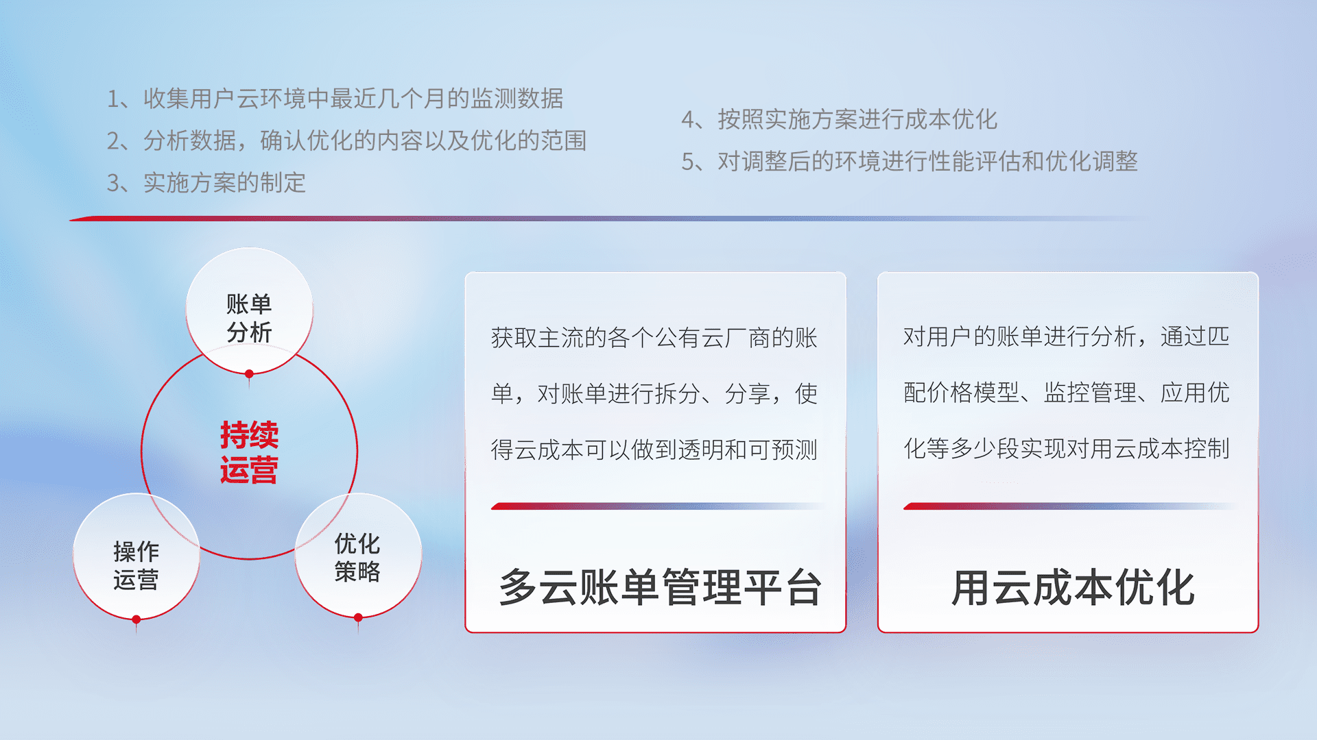 通过多云纳管,,以统一的资源数据模型把客户的云资源进行抽象和封装,,,,进而实现对多云资源的统一操作,,,保障云资源管理的可靠性、、稳定性与可用性。。量身定制化运维内容,,配置、、、开发运维、、、补丁管理、、、备份、、、监控、、认证和访问管理、、审计和日常巡检等,,保障在用云过程中的可靠度,,,稳定度以及高可用率。。