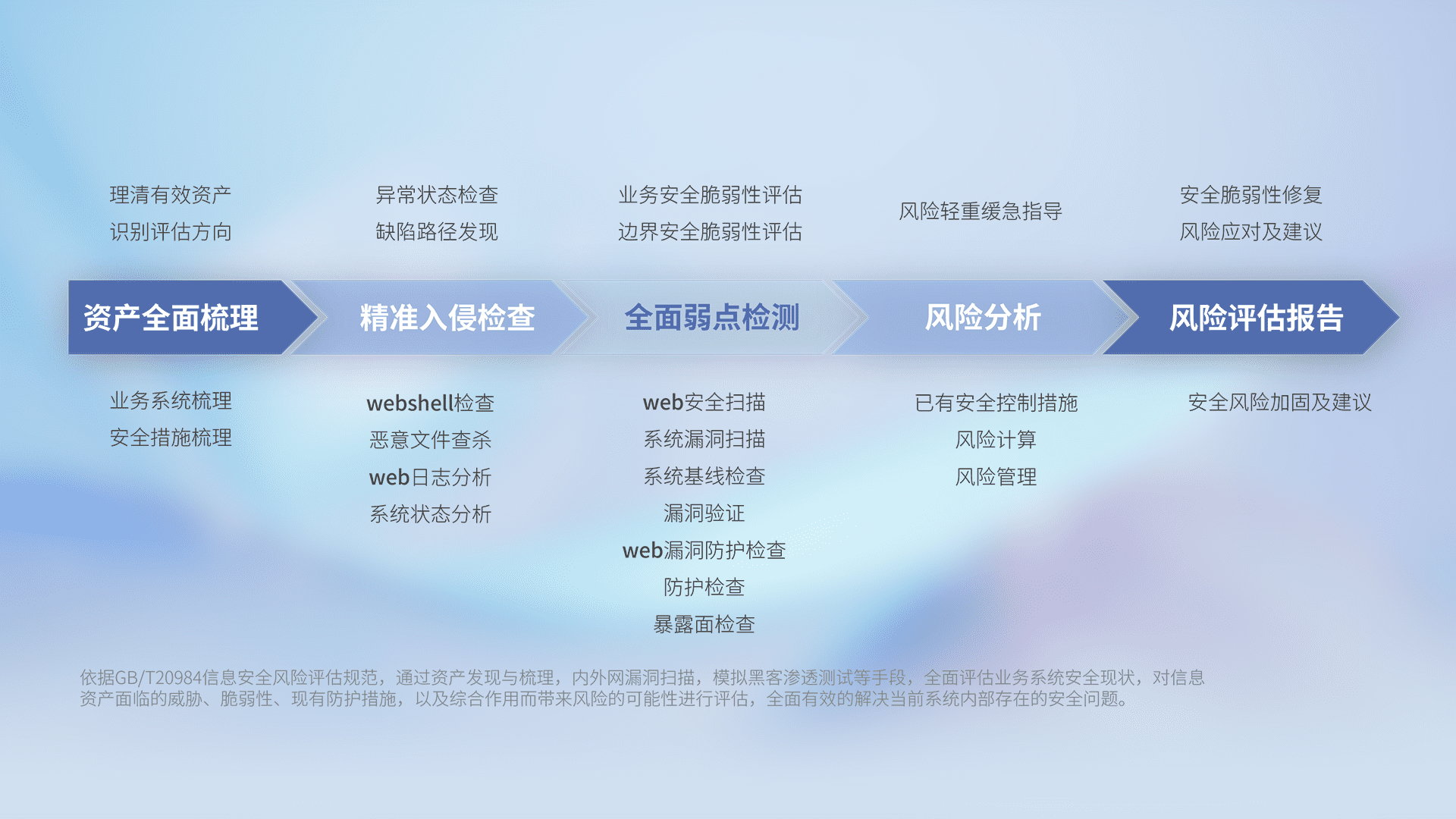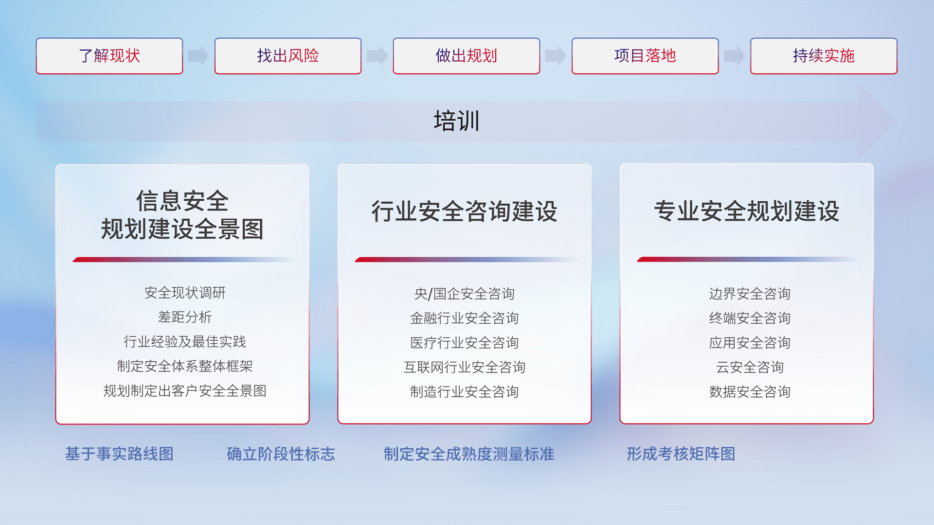 针对客户行业特性,,,,以专业的安全服务+多厂商联合解决方案提供专属的一站式安全管理服务,,帮助客户全面感知网络空间威胁,,,基于识别、、检测、、分析、、、防护、、监测、、响应的服务理论模型,,从方案咨询、、集成交付、、评估验证、、、、优化加固、、运维运营,,,致力于为客户提供完整的闭环管理式安全服务。。。。以实战经验为客户打造高抵御风险的安全体系,,,帮助客户发现威胁、、对抗威胁、、、处置威胁,,,不断积累安全对抗能力,,,,持续保障数字化安全。。。。
